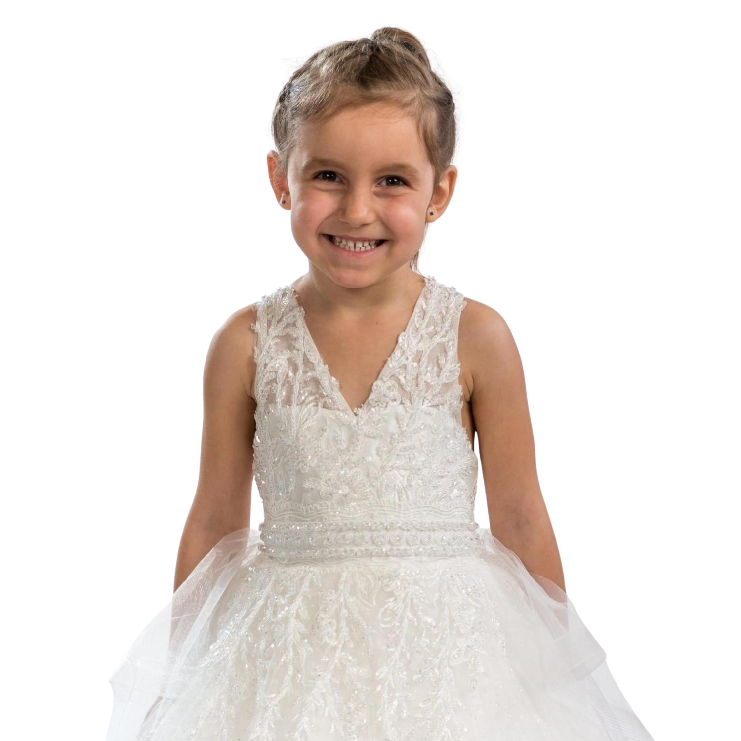 A real wedding gown...for kids! Elegant, very poufy tulle dress with bridal beads and pearls and removable big matching bow in the back. An exclusive JuniorKids creation!